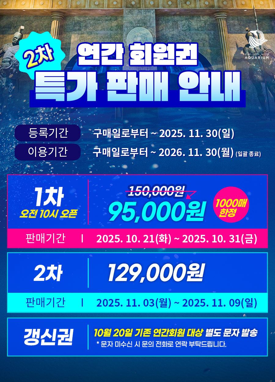 2025 대전엑스포아쿠아리움 연간회원권 2차 특가올해 마지막 연간회원권 특가 기회! 놓치지 마세요1차 특가• 가격: 95,000원 (36%↓)• 판매: 10/21(화) ~ 10/31(금) 오전 10시 오픈 ⏰ (일부 소셜의 경우 조기 오픈 될 수 있습니다) 2차 특가• 가격: 129,000원 (14%↓)• 판매: 11/03(월) ~ 11/09(일) 기존 연간회원 갱신 안내10/20(월)에 별도 문자 발송*문자 미수신 시 문의전화로 확인 가능등록 기간• 구매일 ~ 11/30(일)이용 기간• 구매일 ~ 2026/11/30(월) (일괄 종료) 10월 21일 이후부터 아래 경로를 통해 구매하실 수 있습니다.• 인스타그램 상단의 구매 링크• 대전엑스포아쿠아리움 공식 홈페이지• 네이버, 쿠팡 등 주요 소셜 판매 사이트. 추가혜택도 가득!연간회원으로 더 알차게, 더 자주 아쿠아리움 나들이 즐기세요 대전엑스포아쿠아리움대전 유성구 엑스포로 1, 지하1층10:30 – 19:00042-607-8852연중무휴